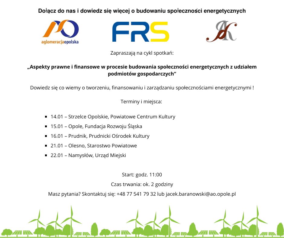 zapraszają na cykl spotkań pt. „Aspekty prawne i finansowe w procesie budowania społeczności energetycznych z udziałem podmiotów gospodarczych”.